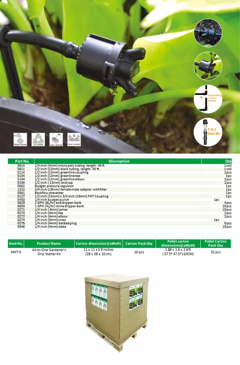 MMIP è un produttore professionale di kit iniziale per gocciolamento per giardinieri All In One. Abbiamo controllato rigorosamente i processi di produzione e spedizione per garantire che i prodotti che ricevi siano della massima qualità. Con 20 anni di esperienza nelle esportazioni del commercio estero, siamo per voi un partner affidabile.