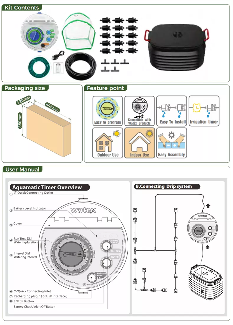 Il timer per irrigazione Aquamatic Drip è un timer intelligente per l'irrigazione dei fiori con il marchio Watex. La caratteristica di questo timer è che può annaffiare le piante senza essere collegato ad un rubinetto. Hai solo bisogno di avere un contenitore per l'acqua e il timer di irrigazione assorbirà automaticamente l'acqua per irrigare le piante all'ora impostata. E' un prodotto adatto all'uso domestico.