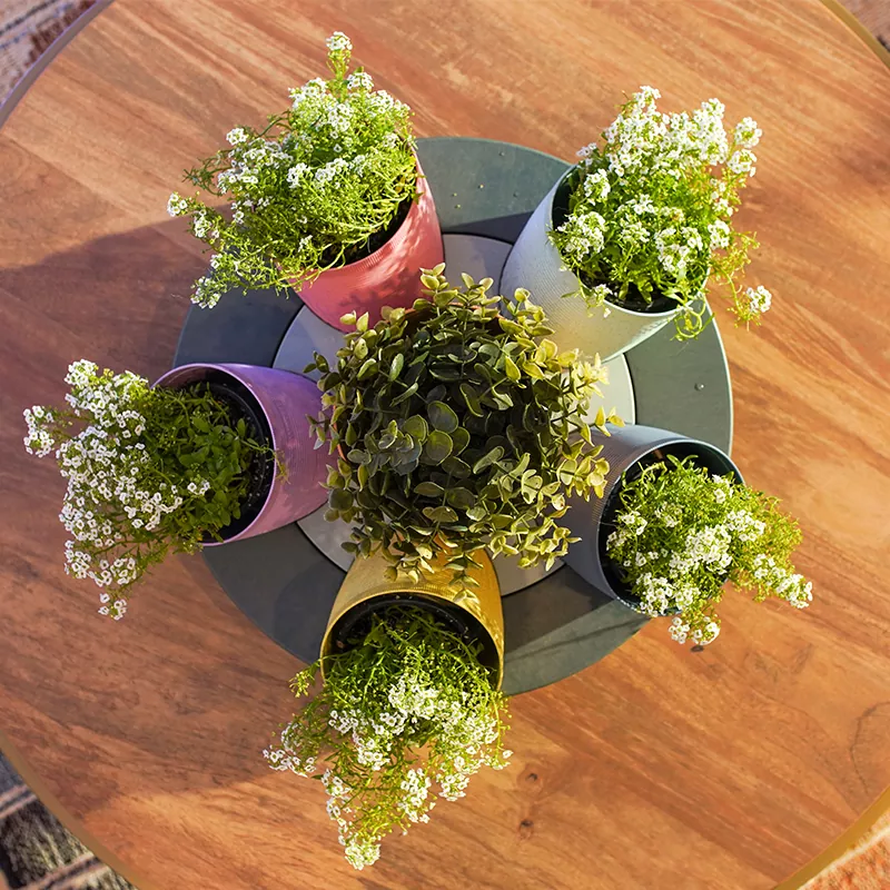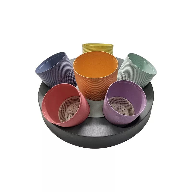 Fioriera a vaso rotondo Eco Gardening Il set di componenti è composto da sei vasi da fiori con fondo traspirante e una base circolare per la conservazione dell'acqua. Tra questi, ci sono cinque vasi da fiori da 5 '' e un vaso da fiori da 6 ''.