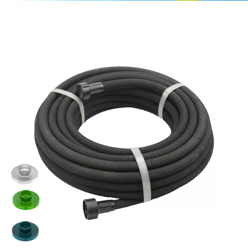 La serie di tubi gocciolanti da giardino watex è realizzata in resistente gomma riciclata per formare un tubo flessibile con micropori incorporati. Quando è collegata a una fonte d'acqua, l'acqua filtra lentamente attraverso i pori capillari nella parete del tubo sotto la pressione dell'acqua.