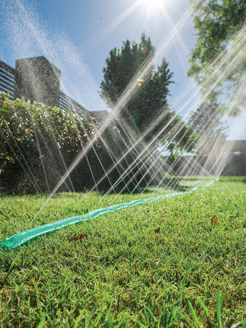 Il tubo Watex Soaker (verde trasparente) è un tubo piatto e flessibile con piccoli fori di spruzzo d'acqua integrati. Quando è riempito d'acqua, il tubo si espande sotto pressione e l'acqua fuoriesce attraverso le sottili perforazioni in una delicata nebbia simile a una pioggia. Ciò lo rende ideale per irrigare uniformemente grandi aree come prati e giardini.