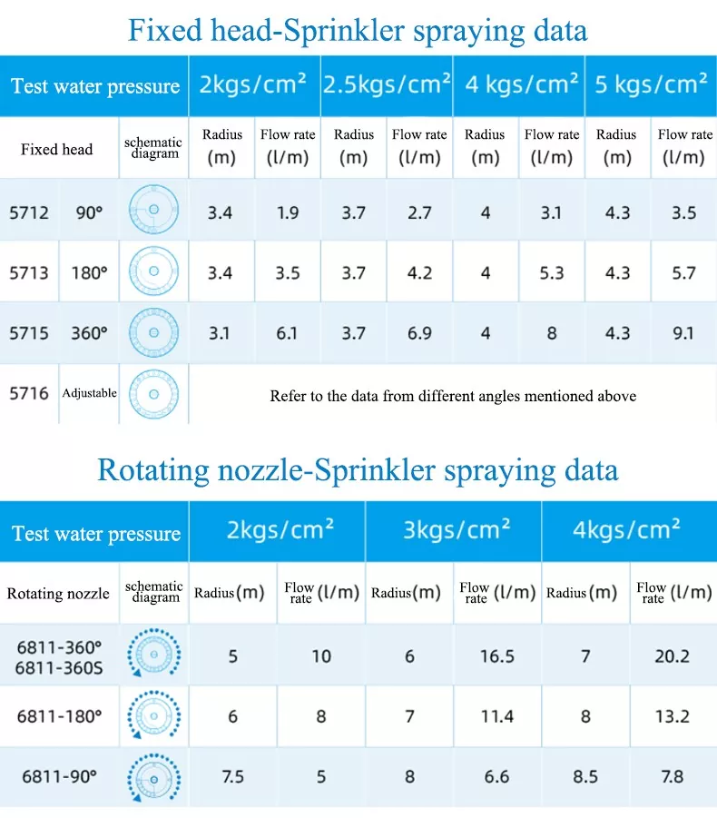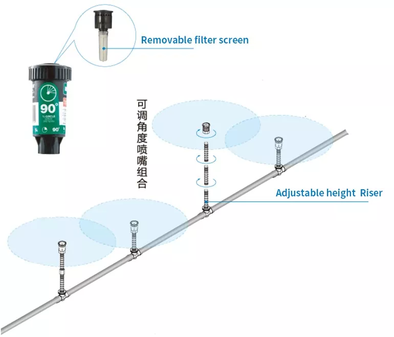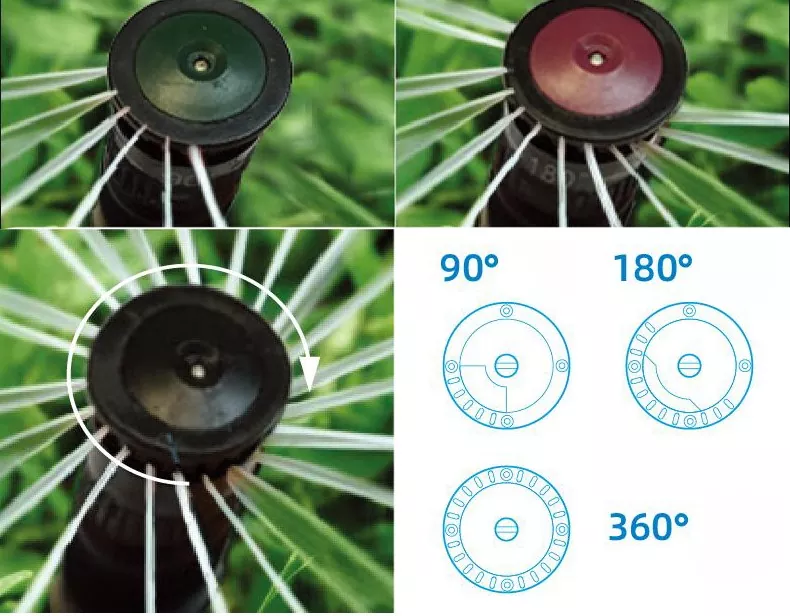 I nostri prodotti coprono due tipi di irrigatori: rotativi e fissi. Sia gli irrigatori rotanti che quelli fissi offrono opzioni di angolazione come 90°, 180° e 360°, abbinati a irrigatori interni ad angolo personalizzabile, possono soddisfare le esigenze di diversi scenari di irrigazione da aree fisse a regolazioni flessibili, da piccole aree angolari a grandi aree intere, senza la necessità di acquistare attrezzature aggiuntive.