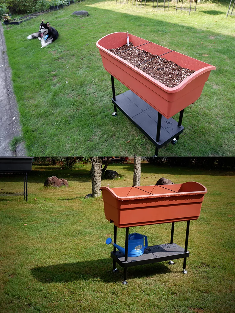 Questo letto da giardino rialzato mobile è progettato appositamente per le persone che non possono chinarsi. Utilizza un telaio in ferro per sollevare i vasi da fiori, consentendo agli utenti di piantare piante stando in piedi. Inoltre viene fornito con un vassoio di plastica dove possono essere riposti gli attrezzi da giardinaggio, che è molto facile da usare per gli anziani.